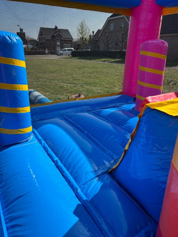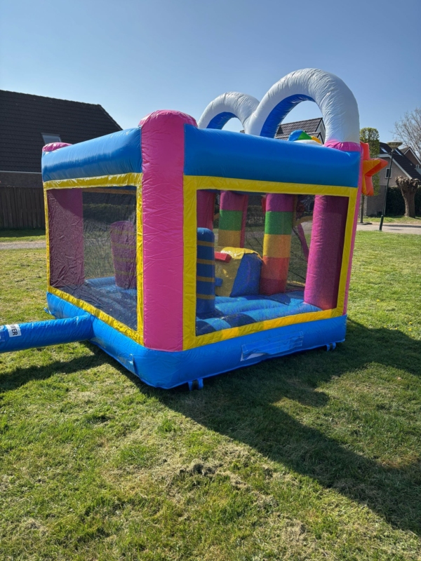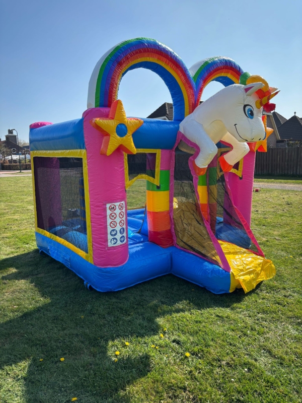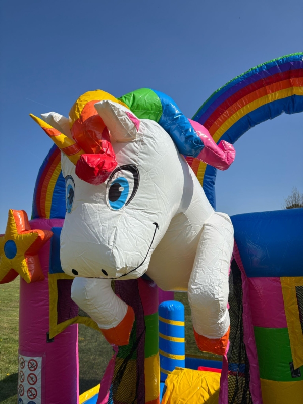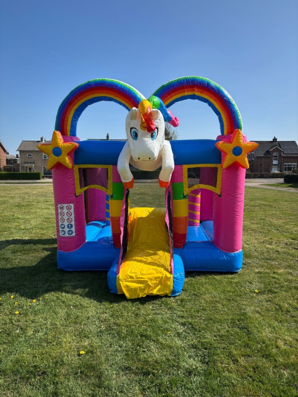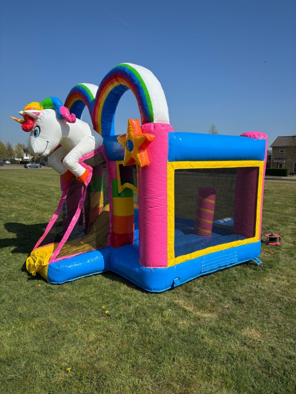 Er was eens een magisch unicorn springkussen, hoog in de lucht tussen wolken van suikerspin en regenbogen. Het stond op een groot feest, waar kinderen met hun ogen vol verwondering het kussen betraden. Het was niet zomaar een normaal springkussen, oh nee! Het had de kleur van de mooiste regenboog: zacht roze, lila, blauw en een beetje goud.